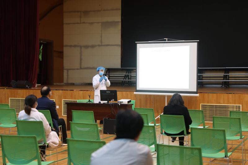 随后,弋江区防控指导员澛港街道社区服务中心张祥医生和罗玉花护士为全体教职员工进行学校疫情防控培训,具体介绍了如何做好个人防护、消毒的基本知识、开学期间出现异常处理等,并现场演示如何正确洗手与佩戴口罩。