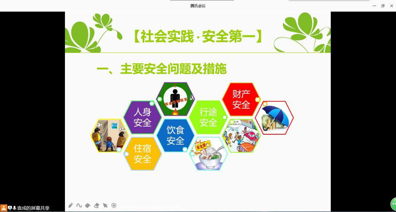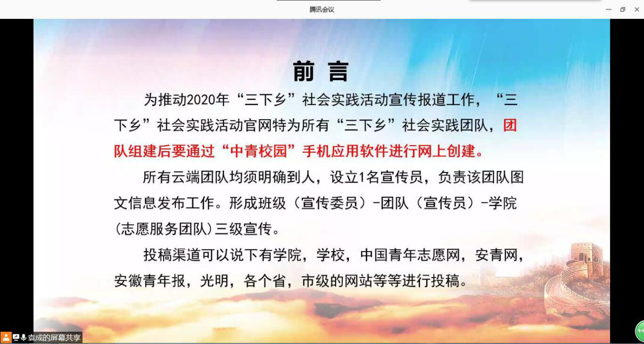 学院2017级李静同学分享了2019年暑期社会实践的经历,为与会人员介绍暑期社会实践中的详细情况和注意事项,包括团队成员的任务分配和关系协调等方面。随后,袁成老师为各团队举行2020年暑期社会实践专项培训和安全培训,向大家介绍了班级(宣传委员)-团队(宣传员)-学院(志愿服务团队)的宣传机制,并分享了投稿的注意事项和相关网站。在安全培训中强调了安全问题的重视性,要求树立安全防范意识,建立健全安全管理机制,每日进行上午和晚间的两次零报告,并列举常见突发状况的处理方法。