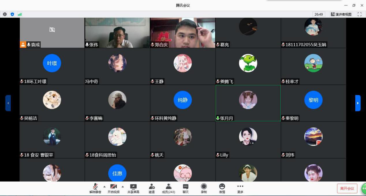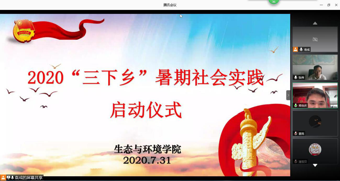 本网讯(生环学院)根据校团委《关于在疫情防控常态化形势下开展2020年大学生暑期“三下乡”社会实践活动的通知》和院团委《关于开展生态与环境学院2020年大学生暑期“三下乡”社会实践活动的通知》,7月31日下午,生态与环境学院在腾讯会议平台举行2020年暑期社会实践启动仪式。院党委书记张伟、暑期社会实践指导老师陶海升教授、团委副书记郑合庆老师、辅导员袁成老师、许楠老师、周毅老师,全体暑期社会实践队员参加了启动仪式,仪式由郑合庆主持。