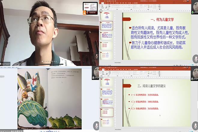 不仅是面向志愿者进行培训指导,文学院教师还融入支教课堂、深入一线随队实践。8月12日,文学院副教授张公善老师作为五四爱心学校赴园丁、殷家山社区“以云为梯,悦读童心”暑期实践团队的指导老师,以“好故事塑造好人生:阅读儿童文学的意义和建议”为主题,从“何为儿童文学”“阅读儿童文学的意义”“阅读儿童文学的建议”三个模块,为团队队员和小朋友们上了一节别开生面的儿童文学课。张老师希望大家都能邂逅一个给予自己力量、智慧和温暖的好故事。张公善老师的讲座独具魅力,让听课的孩子们意犹未尽,同时也让整个团队受益匪浅。