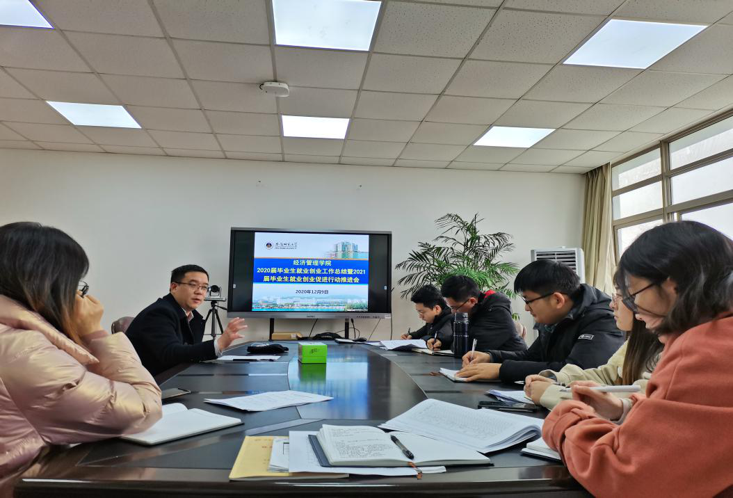本网讯(经管学院  刘胡海)为进一步贯彻落实学校毕业生就业创业工作会议总体要求,推进毕业生就业工作,为2021届考研就业工作总结经验、指导方法、创新思路。12月9日下午,经管学院在四楼会议室举行2020届毕业生就业创业工作总结会暨2021届毕业生就业创业促进和学生职业发展教育工作推进会。院长张廷龙、党委副书记李海燕以及全体本科生、研究生辅导员参加。