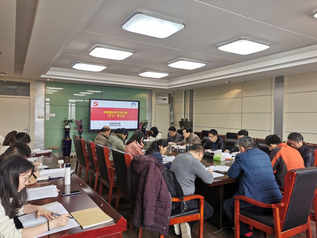 本网讯(外国语学院 张玉楠)3月12日下午,外国语学院开展党史学习教育专题研学会暨党委理论学习中心组(扩大)学习会,专题学习研讨习近平总书记在党中央党史学习教育动员大会上的重要讲话精神,学院领导班子成员、科级干部、党支部书记、辅导员参加学习。院党委书记余国升主持会议并领学。