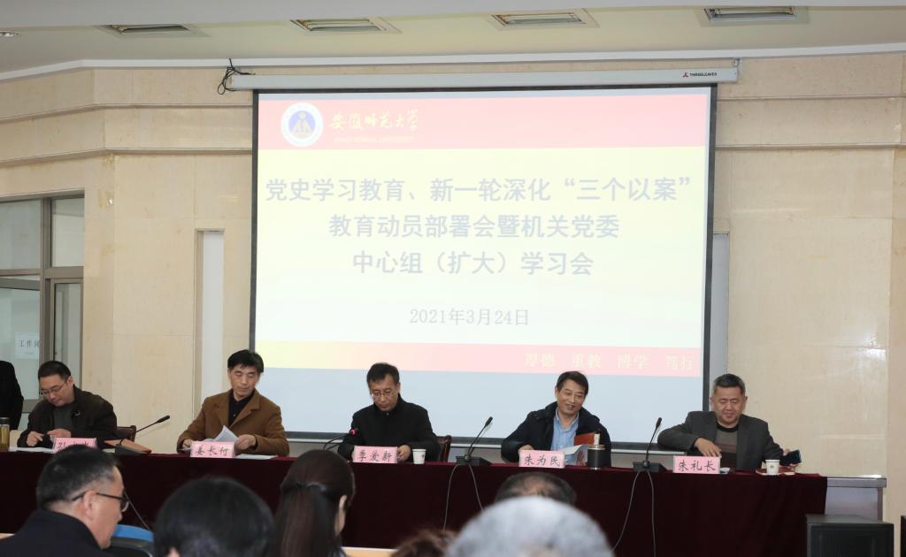 本网讯(机关党委)3月24日下午,机关党委在财务处二楼视频会议室召开党史学习教育、新一轮深化“三个以案”教育动员部署会暨中心组(扩大)学习会,机关党委委员、机关各支部书记及支部委员参加会议。