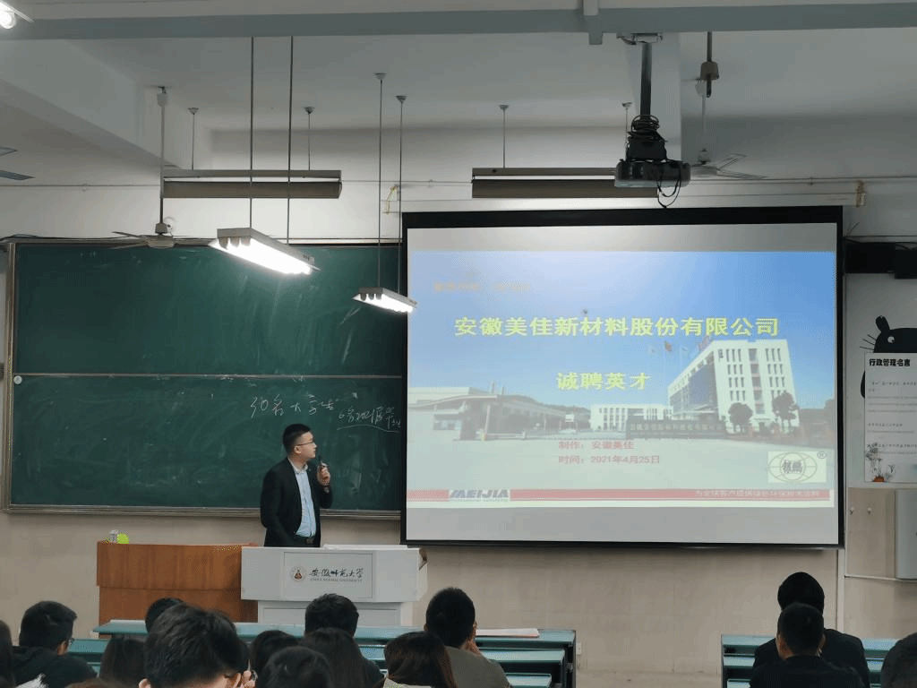 安徽美佳新材料股份有限公司、安徽艾密克电联科技有限责任公司、安徽圣奥化学科技有限公司、安徽神剑新材料股份有限公司、安徽东华通源生态科技有限公司五家公司分别从公司的发展现状、战略目标、产品应用行业、企业文化环境、招聘岗位要求与福利待遇等方面向作毕业生具体介绍。参会同学们都仔细聆听,并积极参与提问。