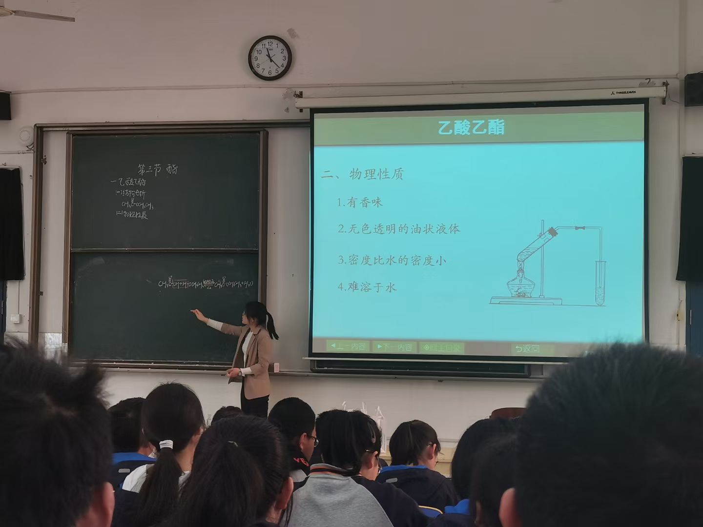 4月29日上午,孙影、张四方、程瑶琴老师带领2019级化学专业2班(57人)来到芜湖市第十二中学,观摩学习2018级化学专业实习生张思雨的公开课。张思雨围绕“烃的衍生物——酯”内容开展教学利用香蕉和芒果的香味引出教学主题,调动课堂氛围,从酯的结构、命名、物理性质、化学性质以及制备方法,充分利用教学技术,将课堂与互联网紧密相连,在授课的同时增加了课堂互动,授课思路清晰,理论知识厚实,获得了见习同学的热烈掌声。课后,张四方老师从教学思路和时间把握给予肯定,并授予进一步完善授课的技巧。参与教育见习的同学们认真听讲,课后与教育实习的学长学姐进行热切交流,认识到教育见习的重要性,对明年的教育实习生活有了更高的期待。