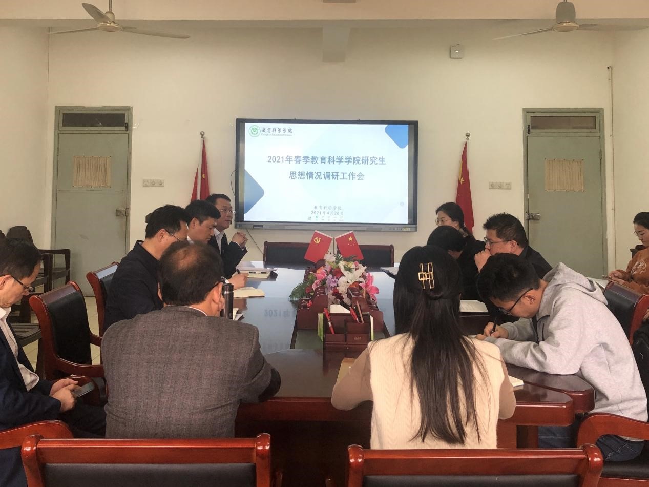 本网讯(文/唐小菲 何亮图/唐小菲)为充分了解新学期研究生思想动态和学习生活情况,扎实推进学院研究生教育管理服务工作,4月28日下午4时,2021年春季教科院研究生思想情况调研工作会在学院308会议室举行。学院党委书记方泓、院长李宜江、研究生工作分管副院长张更立,以及部分导师代表、研究生教务员、辅导员出席此次会议,本次会议由研究生工作分管副院长张更立主持,30余名研究生代表到场参会。