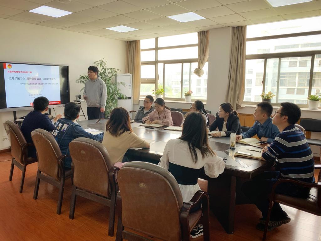吕洋围绕学习习近平总书记在考察清华大学时发表重要讲话精神,结合自身工作,从习近平总书记考察清华大学时发表的重要讲话内容及精神、如何提升思想政治教育的“实效性”、辅导员工作思考等三个方面带来了《立足学团工作,做好思想引领,培育时代新人》的专题报告。吕洋从习近平总书记在考察清华大学时发表的重要讲话,特别是关于青年大学生成长成才的重要论述出发,分析了当代青年大学生为什么要“肩负历史使命,坚定前进信心,立大志、明大德、成大才、担大任”,高校如何“培养德智体美劳全面发展的社会主义建设者和接班人”。随后,他从“实效性”“时效性”“有效性”的辨析出发,结合工作案例,分析了如何才能提升辅导员思想政治教育工作的实效性。希望在工作中可以加强顶层设计,注重思想政治教育过程的延续性,增进学生对大学思想政治教育的亲密感,优化教育环境,发挥思想政治教育环境的独特作用。通过聚焦“主流供给”,全方位加强学生教育;聚焦“靶向供给”,根据不同学生群体的特点因材施教;聚焦“定制供给”,把握特殊学生个人的思想政治教育需求,进一步提升学生的“获得感”和思想政治教育的实效。