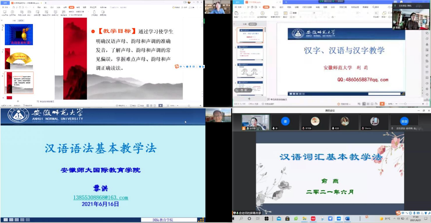 国际教育学院许凌虹、荆莉、俞燕、黎洪四位老师分别以《汉语语音基本教学法》、《汉字、汉语与汉字教学》、《汉语词汇基本教学法》、《汉语语法基本教学法》为题,向海外汉语本土教师系统介绍了汉语语音、汉字、语法和词汇的课堂教学法和教学技巧,内容丰富且有针对性,互动环节中孔院教师和主讲老师还就教学活动中遇到的教学问题展开广泛讨论。