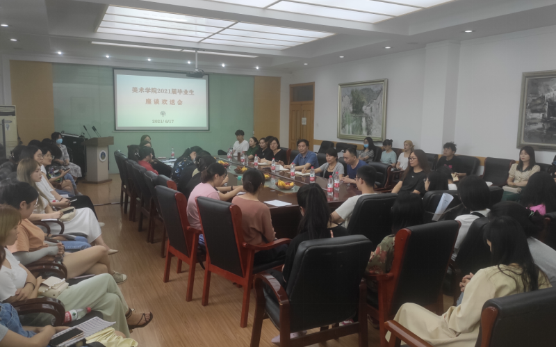 6月17日下午,学院在三楼大会议室举行2021届毕业生座谈欢送会,学院领导班子及专业负责人到场。会上,毕业班学生代表结合四年所学、所思、所感,畅谈自己的未来,表达自己对母校、母院和老师的感激之情,情真意切。院长高飞结合自己当年的学习和工作经历,与同学们分享了毕业季的心情,并向2021届全体同学表达美好祝愿和期望,鼓励同学们在未来人生道路中要坚持艺术初心,不断努力,做一个有高度、有深度的青年。高飞借李苦禅语“鸟欲高飞先振翅,人求上进先读书”寄语2021届毕业生。