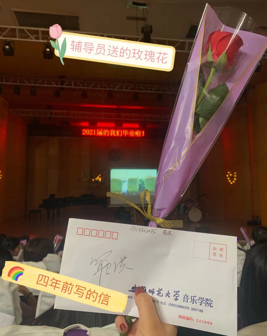 这是一场青春欢送,回忆过去拥抱未来。由于疫情原因,原定的毕业晚会不得不取消,但为了给毕业不留下遗憾,在符合防疫规定情况下,辅导员悄悄精心布置音乐学院音乐厅,制作回忆照片集、拍摄祝福寄语视频、准备节目,在毕业生返校时给他们惊喜,辅导员高燕更是用歌声传递对毕业生的不舍和殷切期望。一封四年前的信,让同学们的思绪回到四年前。随后毕业生们争相上台用歌声表达对学校、学院以及友情、师生情的不舍。打开手机灯光,随着音乐挥舞,这是一场青春欢送,在那一刻,所有同学的心都在一起回忆过去拥抱未来。