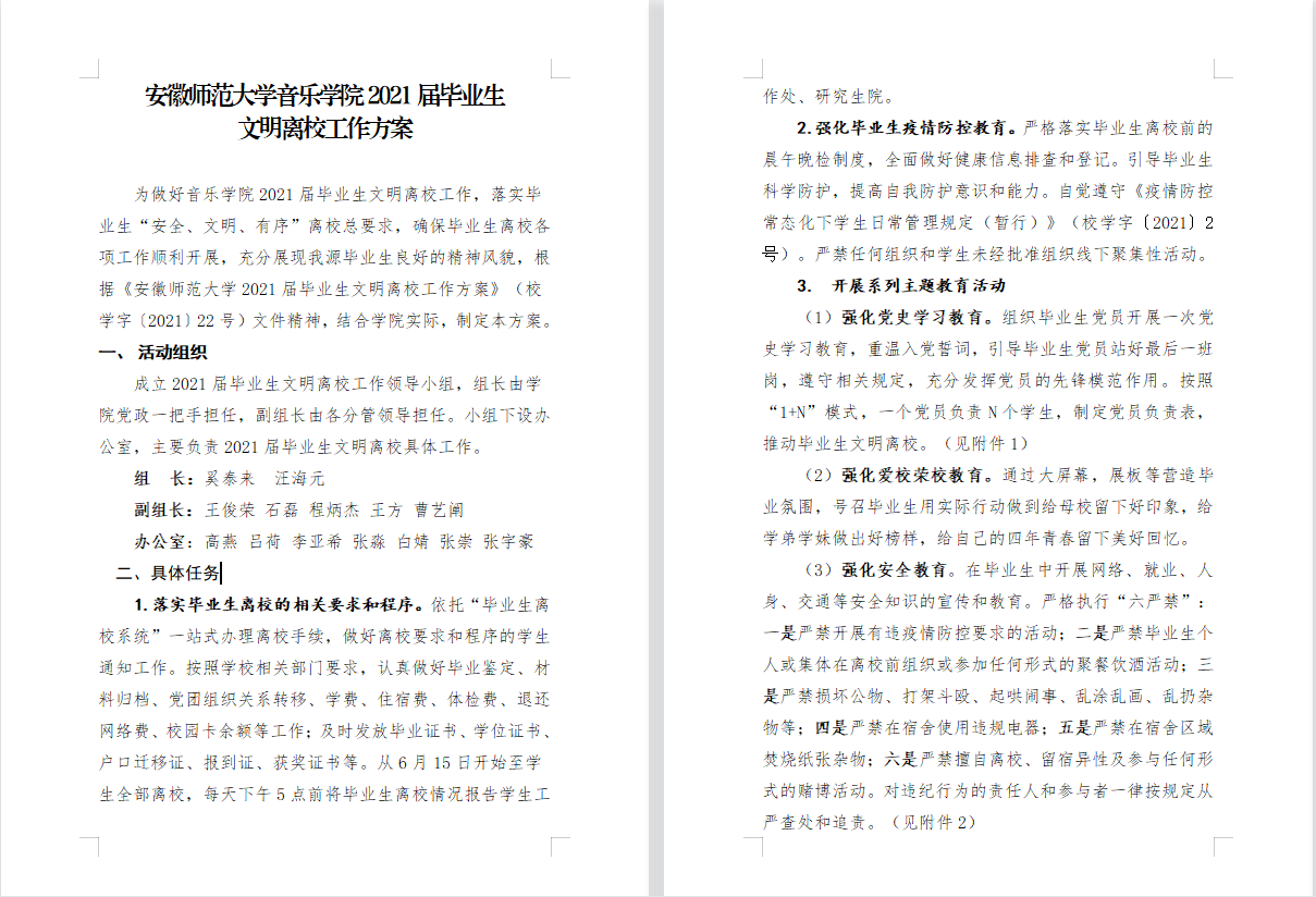 本网讯(音乐学院 高燕)四年时光似箭未曾虚度,祝愿前途似锦来日方长。音乐学院为扎实做好2021届毕业生文明离校工作,多次召开专题会议,制定详细毕业生文明离校工作方案,营造温馨毕业氛围,开展各类“暖心服务”,传递人文关怀,打造别样毕业季。
