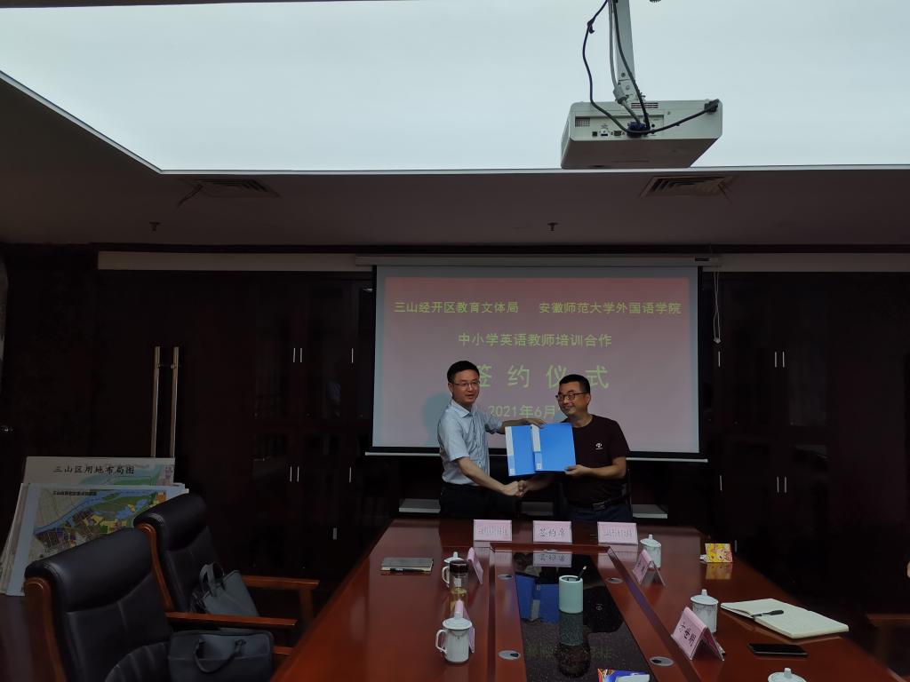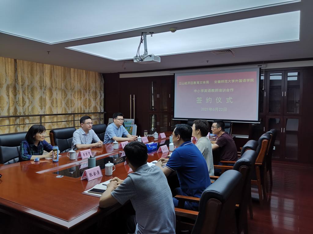 本网讯(文/图 熊义信)6月22日下午,外国语学院与三山经济开发区中小学英语教师培训合作签约仪式在经开区管委会会议室举行。三山经济开发区管委会副主任王亚莉、教育文体局教育科副科长章强、教研室主任方世明、中小学英语教研员张金勇、任飒,外国语学院院长张孝荣、党委副书记杨一飞、副院长李碧鹰参加仪式。签约仪式由章强主持。