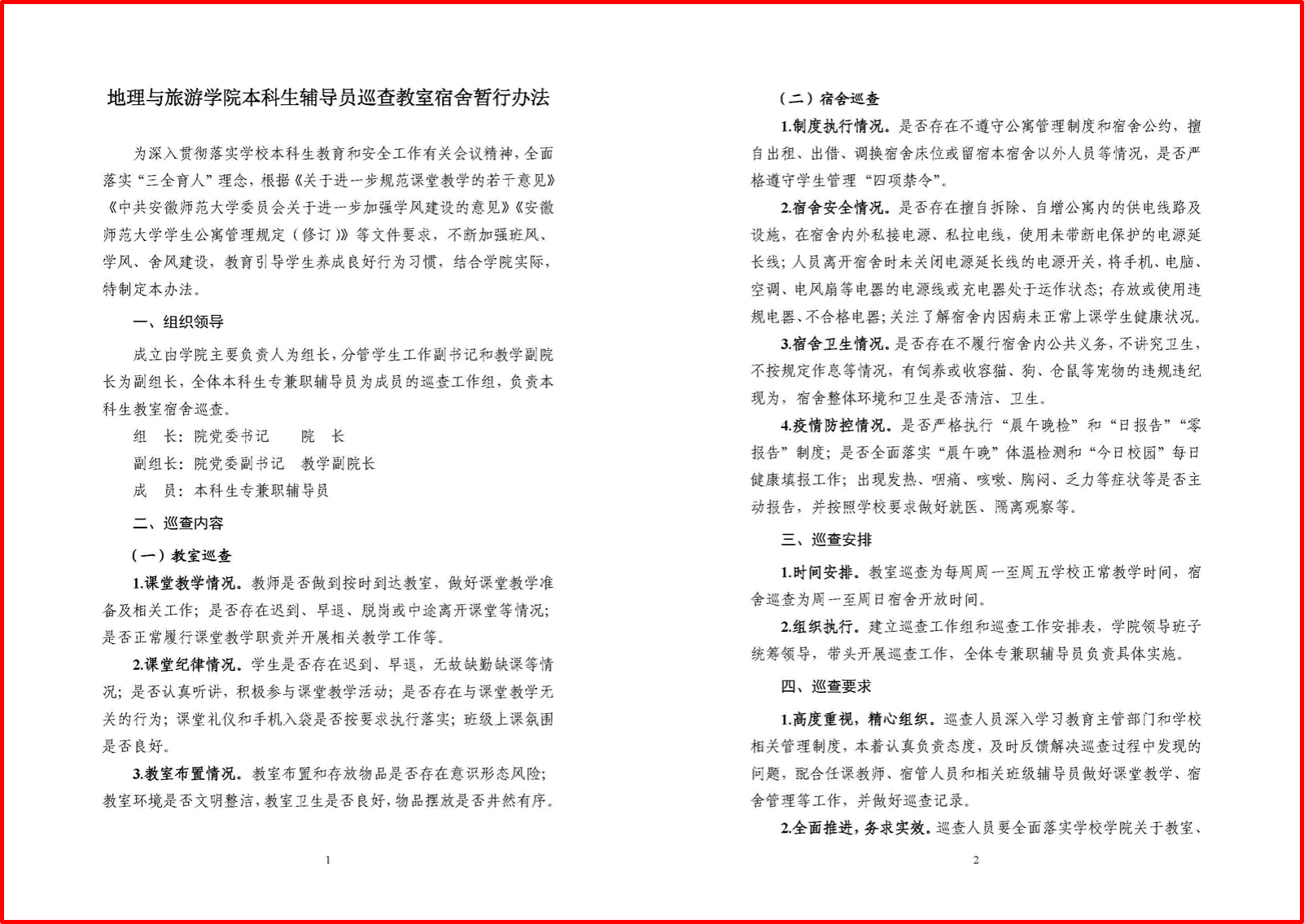 制度具有管长远、管全局的重要作用。为了开展教室宿舍巡查于理有据,有制度支撑,地旅学院高度重视制度建设,把制度建设放在首位。根据学校关于课堂教学、学风建设、公寓管理等相关文件要求,加强顶层设计,注重把握精神,结合学院实际,制定了《地理与旅游学院本科生辅导员巡查教室宿舍暂行办法》,规定了开展巡查工作的组织领导、巡查内容和安排、要求。