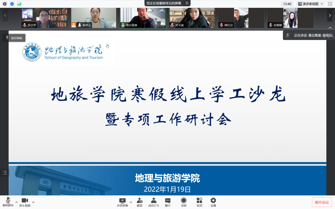 1月19日下午,地旅学院利用腾讯会议召开线上学工沙龙暨专项工作推进会,全体专兼职辅导员参加会议。会议由学院党委副书记乔静主持。