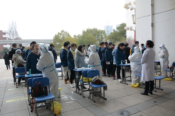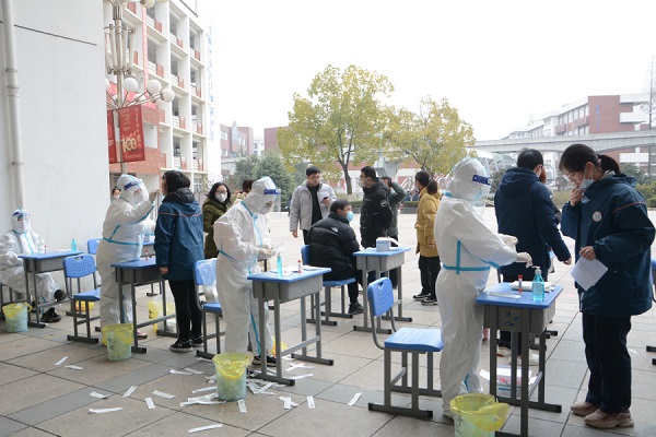 为进一步筑牢学校疫情防控防线,根据镜湖区防控中心统一安排,2月16日上午,安徽师范大学附属中学开展全体师生核酸检测工作。在学校萃文楼门厅,师生有序排队等候核酸采样。为了避免人员聚集,学校按照分批分时间段分年级的原则,以班级为单位,安排师生错时错峰采样。大大缩短了检测等待时间,让整个核酸检测过程更加规范、顺畅。