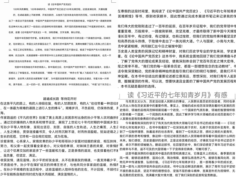 为了督促学生在寒假期间品读名著,在读书中有所收获,学院给同学们提供了《论中国共产党历史》《习近平的七年知青岁月》《苦难辉煌》《平凡的世界》等相关书目,要求大家在读书的同时完成高质量的读书笔记。通过阅读增加了同学们自身的知识储备,锻炼了文字表达和思考能力,为专业学习打下了坚实的基础。