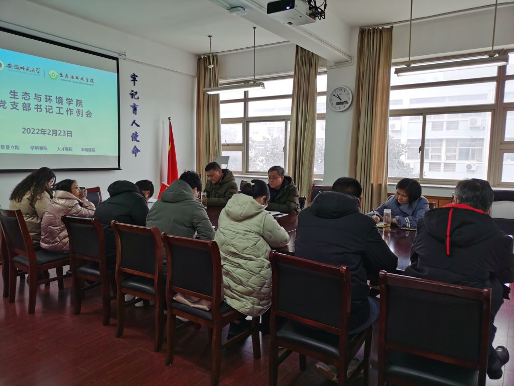 2月23日上午,生态与环境学院召开党支部书记工作例会,交流、研讨、谋划2022年度学院党建工作。学院党委书记张伟,党委副书记、院长胡好远,副书记杨友谊,各党支部书记参加了会议。会议由张伟主持。