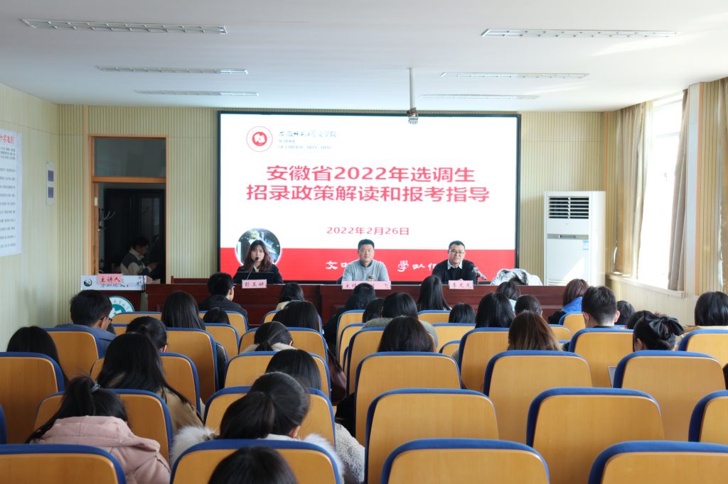 为做好2022届毕业生就业指导和服务工作,充分发挥优秀毕业生榜样示范引领作用,2月26日下午,文学院组织召开安徽省2022年选调生招录政策解读及报考指导会,学院符合选调生报考条件的2022届毕业生参会。芜湖市委组织部干部二科副科长、2015届对外汉语专业毕业生李龙龙,池州市石台县矶滩乡人民政府党政办公室科员、2020届汉语言文学专业毕业生彭玉妍应邀出席,倾心分享。本次会议由文学院党委副书记刘飞主持。