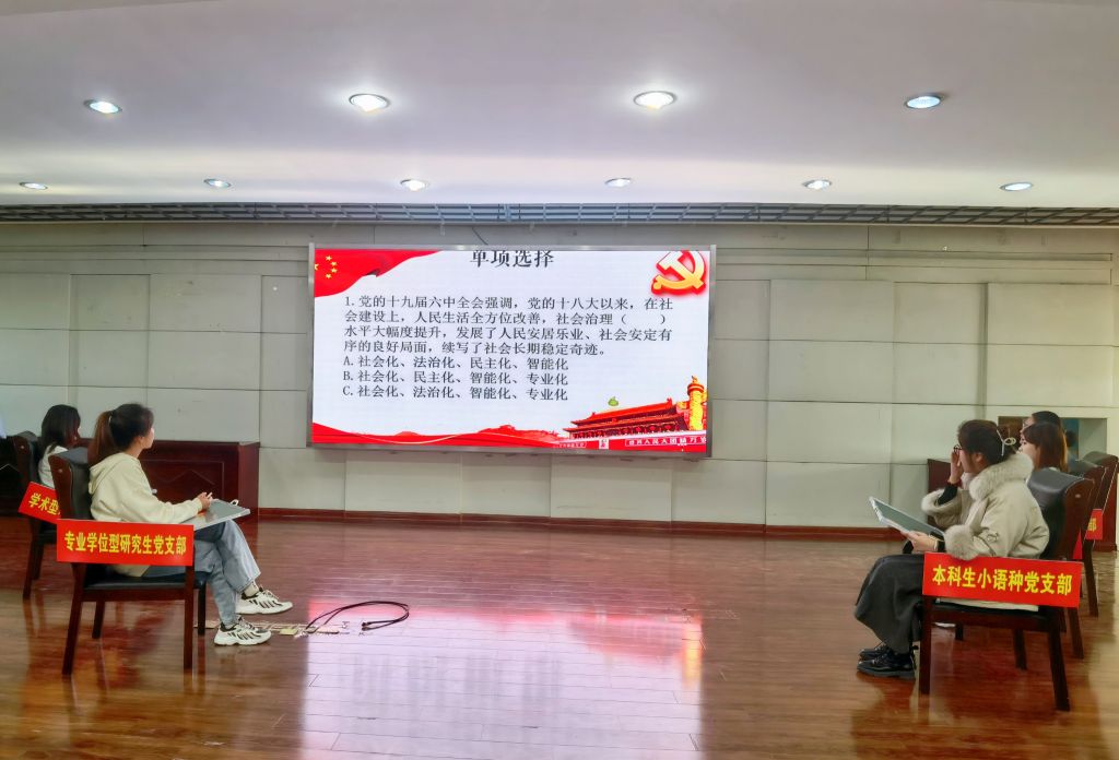 本次比赛创新方式,将问答环节与观众互动相结合,寓教于乐,气氛热烈。多段式题目带领大家回顾党的各个历史时期大事件、了解红色人物的背后故事;《没有共产党就没有新中国》《我和我的祖国》等一首首红歌跟唱,奏响大家心中的爱国主旋律;理论知识传声筒通过通俗易懂的游戏形式,引领大家在短时间内理解记忆习近平总书记的讲话金句。知识竞赛环节融导向性、知识性、挑战性为一体,系统地考察了参赛选手学习党的十九届六中全会精神和习近平总书记重要讲话精神。最终,本科生小语种党支部获得一等奖。