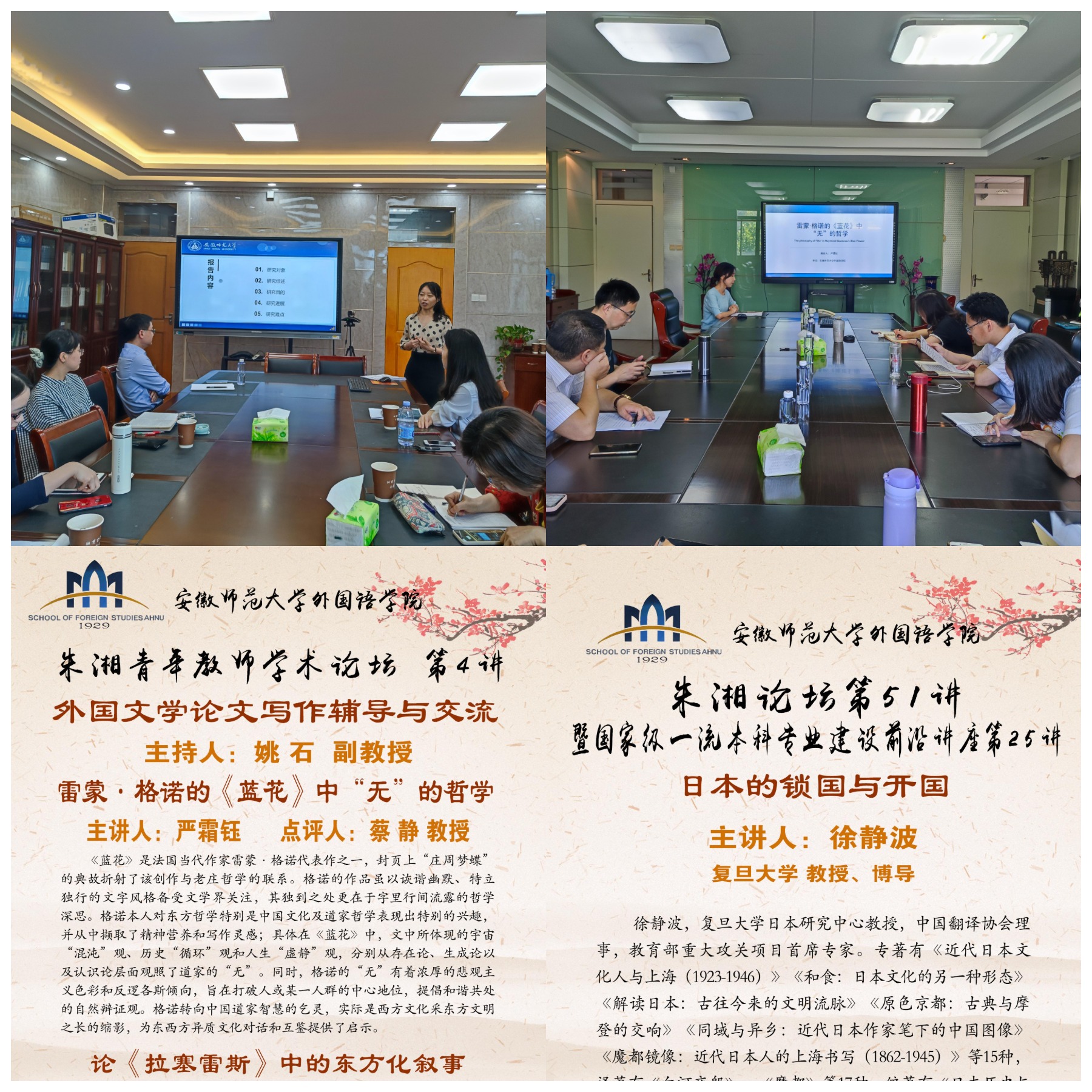 通过“朱湘论坛”系列学术讲座指导青年教师掌握科研方法。科学研究需要掌握科学的研究方法,如何发现问题、解决问题,是青年教师提升科研能力的重要环节。学院“朱湘论坛”组织邀请浙江大学郝田虎教授、南开大学张文忠教授、上海外国语大学柴明颎教授、上海外国语大学史志康教授等专家学者开展学术讲座,以外国语言文学研究前沿动态为重点,指导青年教师树立科学素养和逻辑思维,强化科研训练,掌握科研范式。