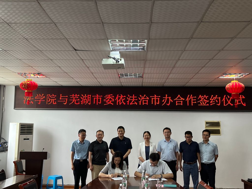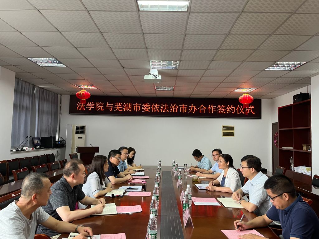 为贯彻“质量立院、特色兴院、人才强院、开放活院”的办学理念,加强学院与政府机关的合作交流,7月7日上午,法学院与芜湖市委依法治市委员会办公室(芜湖市司法局)在法学院会议室举行合作共建芜湖市法治研究院签约仪式。芜湖市委依法治市办副主任、市司法局局长李萍,市司法局纪检组长周正辉,市司法局副局长杨静、叶勇,市委依法治市办秘书科工作人员,法学院党委书记赵红、院长周振杰、党委副书记张玉新、副院长高永周、院长助理陈银珠参加签约仪式。仪式由赵红主持。