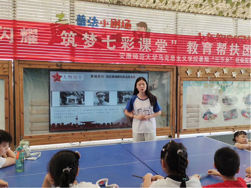 为培养青少年爱国主义情怀,培养有思想、有觉悟、有能力的新时代少年,响应中央关于“双减”的政策号召,丰富社区儿童假期生活,6月27日-7月6日,马克思主义学院赴合肥市瑶海区“百年团徽闪耀 筑梦七彩课堂”教育帮扶团队在凤阳一村社区快乐家园儿童俱乐部开展为期十天的教育帮扶活动。今年也是马院“七彩课堂”团队来瑶海区开展教育帮扶活动的第5年。
