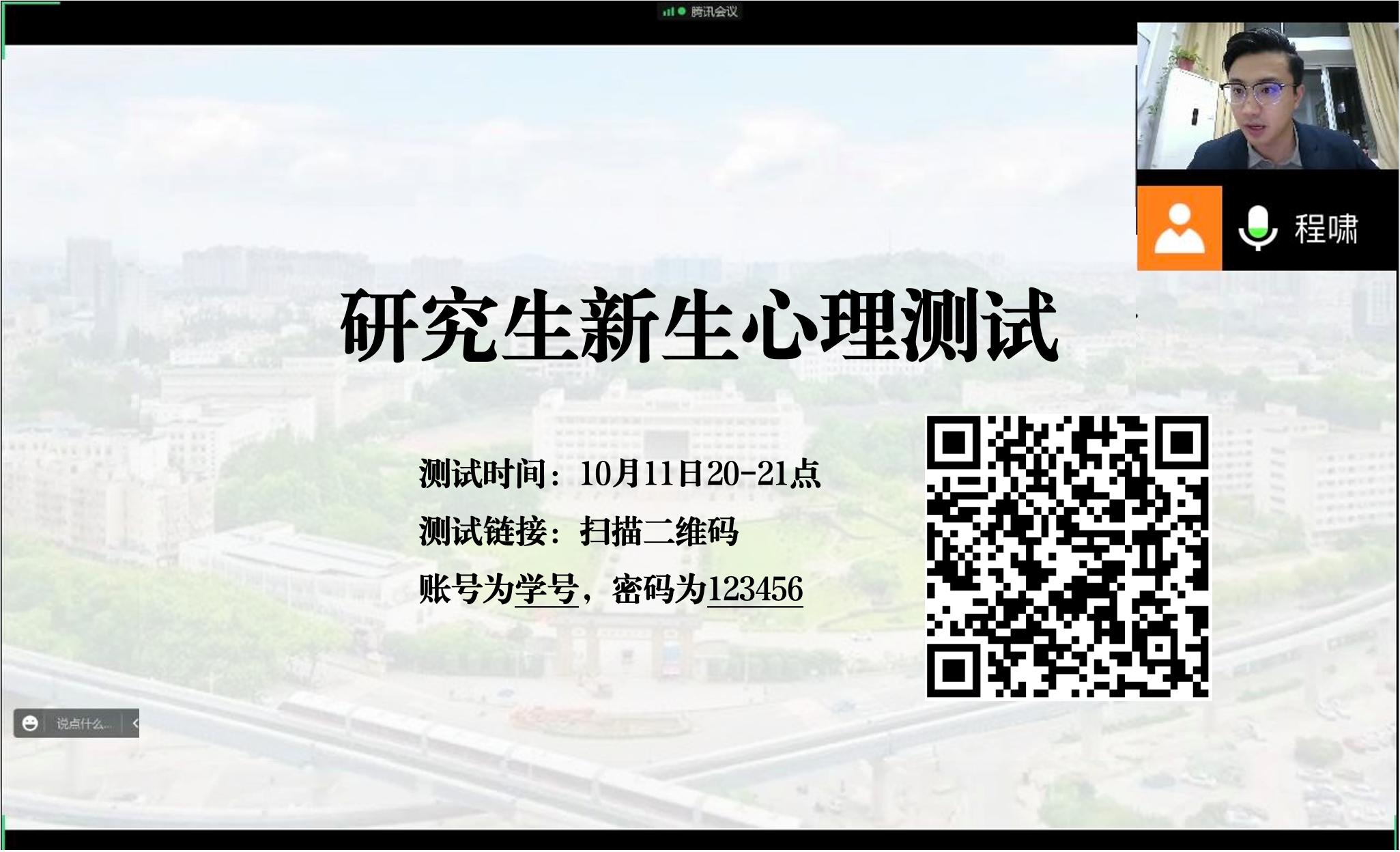 疫情防控形势严峻,10月10日,教科院组织开展2022级研究生线上心理健康普测工作,研究生辅导员程啸强调心理普测的重要性,并建议同学们在测试时尽量保证不受外界干扰,做到有效测试,提高普测信息的真实性。此次心理健康普测工作既帮助研究生全面、客观地认识自己,又为学院心理健康教育工作提供了数据参考,进一步了解研究生的心理状况,完善研究生心理档案。