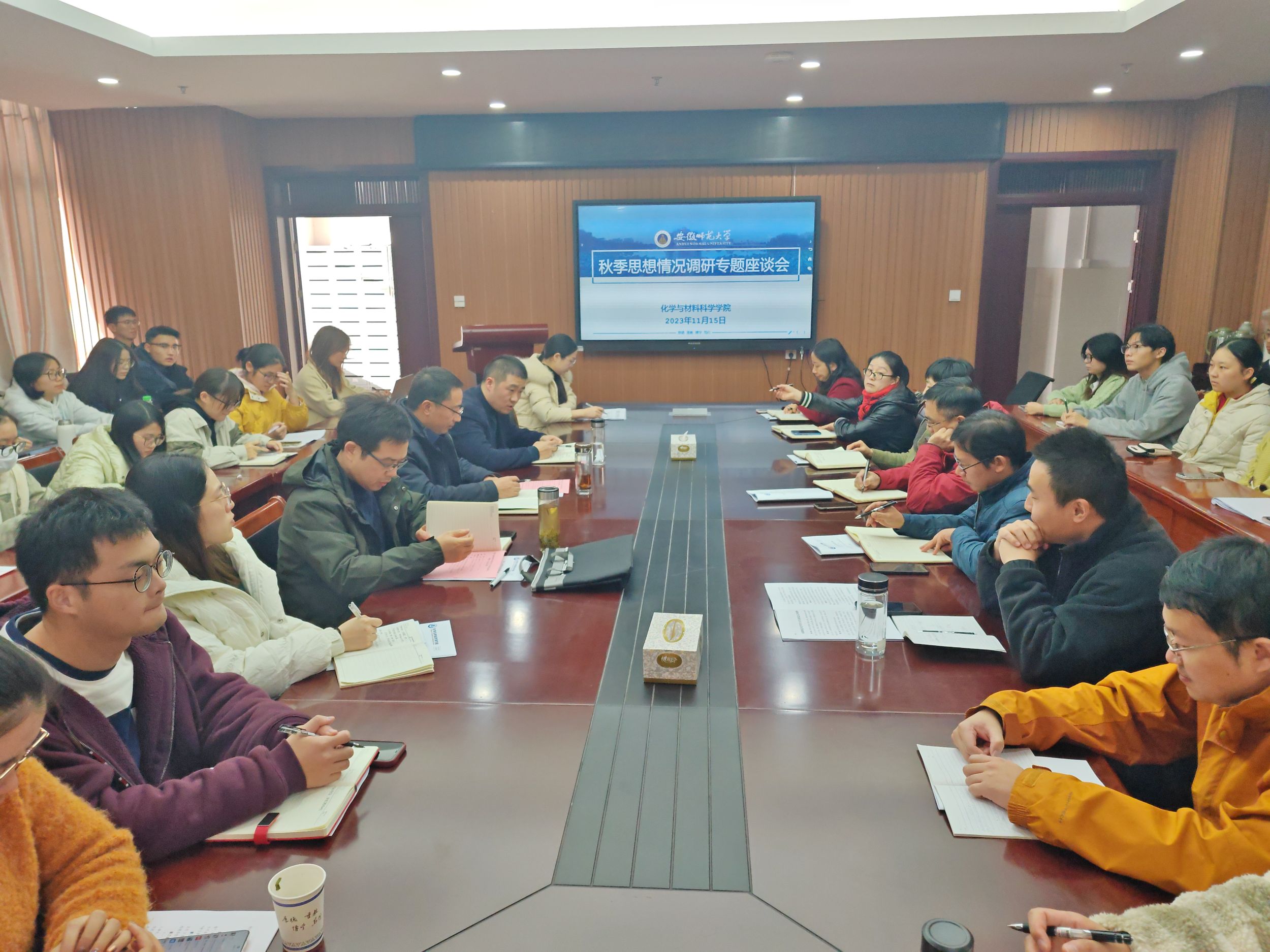 为及时了解秋季学生思想状况,全面研究学生在思想、学习和生活等方面存在的实际问题,有针对性地做好学生教育管理和服务工作,11月15日下午,化材学院在礼勤楼702会议室召开秋季本科生思想情况调研座谈会暨期中教学座谈会,学院党委书记汪俊武,副院长周双六、方臻,各专业系主任,教学科研秘书,全体专兼职辅导员及各班级思政委员、学生代表参加此次座谈会,会议由学院党委副书记李古州主持。