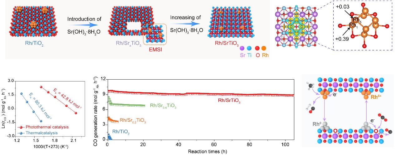甲烷干重整(DRM)是一种能将两种主要温室气体——二氧化碳和甲烷——转化为有用合成气(一氧化碳和氢气)的关键反应。该过程不仅能减少温室气体,还能为化工生产提供原料,因此在碳中和背景下备受关注。然而,传统工艺需要超过800 ℃的高温,能耗巨大,且高温极易导致催化剂表面积碳和烧结,造成催化剂快速失效。近年来,科学家转向利用太阳能来驱动这一反应。这种“光热催化”过程,能够在相对温和的条件下实现合成气的可持续生产。该过程的核心在于催化剂的活性位点——金属原子的电子状态。研究发现,带正电的金属位点能更有效地活化甲烷分子,并引导反应走一条不易积碳的路径。但难题在于,在实际反应环境中,这类活性位点容易被还原失效,导致性能下降。