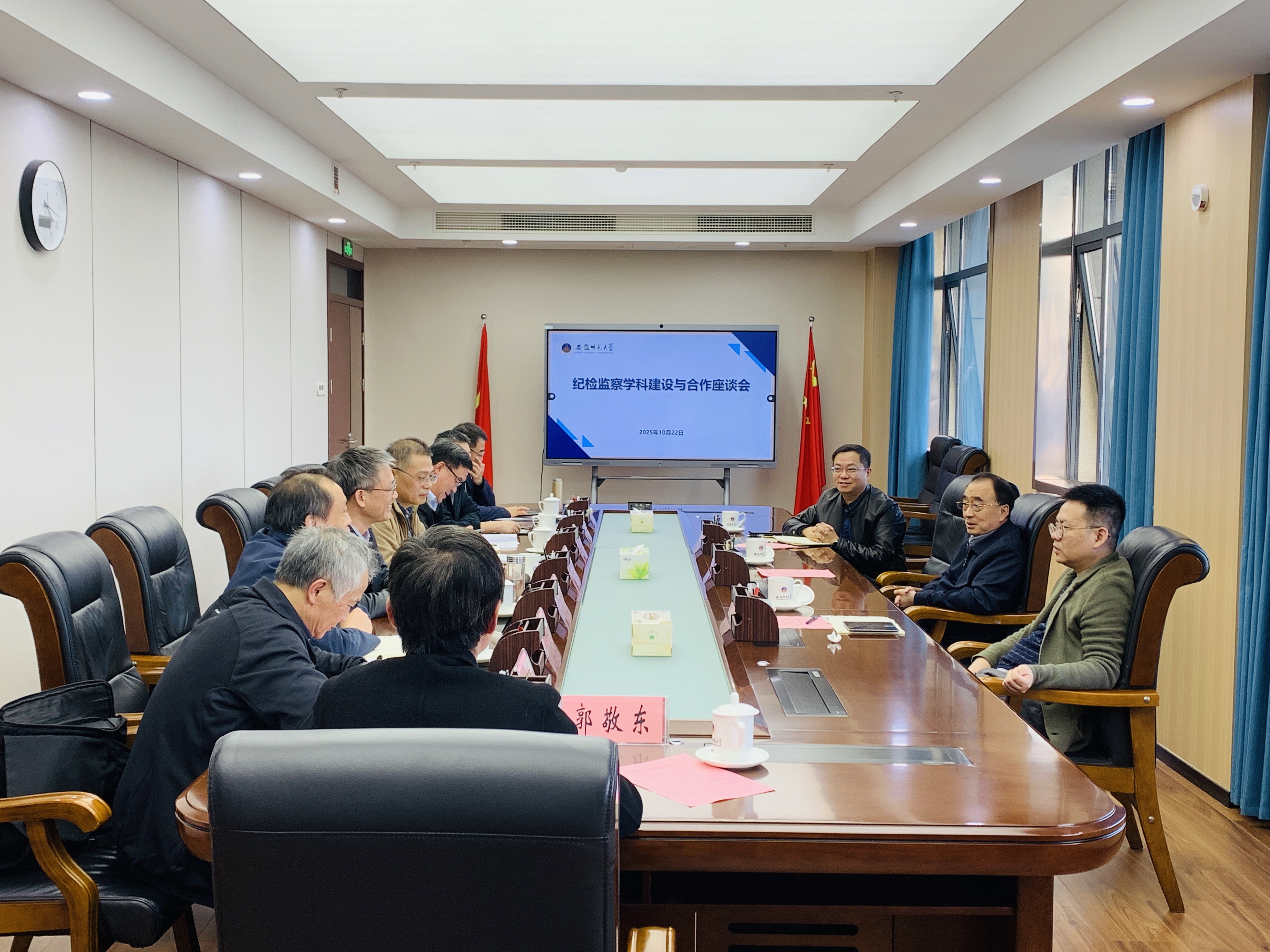 熊宇杰首先代表学校对吴付来的到访表示热烈欢迎。法学院(纪检监察学院)院长郭泽强汇报了学校纪检监察学科发展态势、面临的挑战和未来展望,参会人员围绕纪检监察学科建设与合作展开热烈的讨论。
