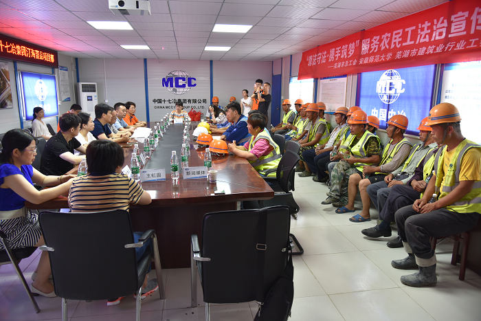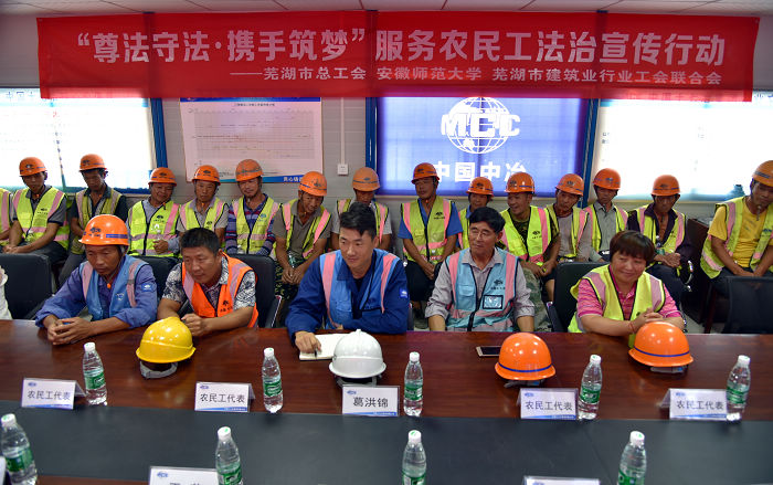 本网讯(校工会吴佑平) 为进一步贯彻落实全国总工会、教育部服务农民工法治宣传工作部署,加强大学生思想政治教育社会实践。7月11日——12日,安徽师范大学联合芜湖市总工会,开展“尊法守法·携手筑梦”服务农民工法治宣传行动,先后走进“芜湖海创·汀海壹品项目工地”、“芜湖新兴铸管有限责任公司”、“芜湖市瑞吉物流公司”,利用高校优势,为农民工现场举行时政法治宣传教育,并对他们进行人文关怀。安徽师范大学工会副主席牧运前、法学院部分教师、学生志愿者以及芜湖市总工会副主席傅松、新闻媒体等人出席活动现场,项目工地一线农民工参加了活动。