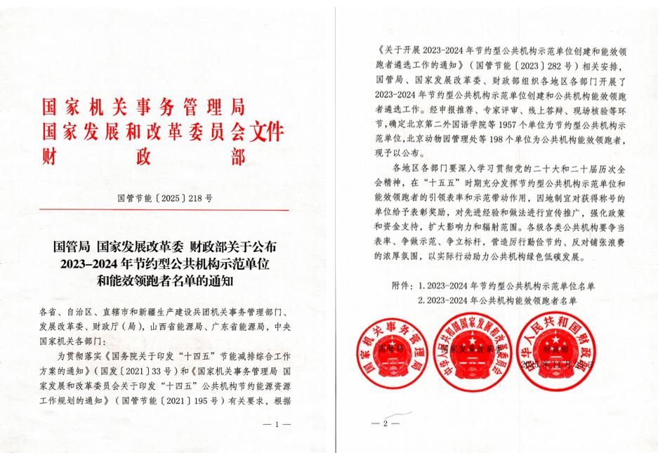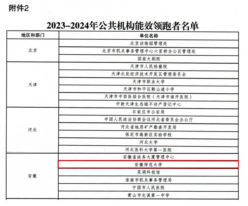 近日,国家机关事务管理局、国家发展和改革委员会、财政部联合印发《关于公布2023-2024年节约型公共机构示范单位和能效领跑者名单的通知》(国管节能〔2025〕218号),我校成功入选“公共机构能效领跑者”名单(安徽省唯一高校)。