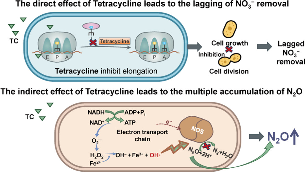 抗生素在环境中的检出越来越多,威胁着微生物介导的氮循环。然而,亚抑制浓度的核糖体靶向抗生素影响反硝化作用和氧化亚氮(N2O)排放的细胞机制尚不清楚。研究团队以模式反硝化菌——Paracoccus denitrificans为对象,系统评估了环境相关浓度核糖体靶向抗生素四环素(TC)对脱氮过程与细胞生理的影响。结果表明,TC在不显著引起细胞死亡的情况下延缓了硝态氮的去除,显著增加了N2O的排放。酶活性测定发现TC对反硝化酶的抑制是普遍和非特异性的,而细胞生理和转录组学分析发现碳代谢和电子传递受到干扰。综合证据表明,TC通过抑制蛋白质合成和葡萄糖利用,并损害电子传递,导致细胞内氧化还原失衡和活性氧(ROS)积累。而抗生素作用下细胞内源产生的ROS通过优先抑制N2O还原酶活性,导致了N2O的积累。