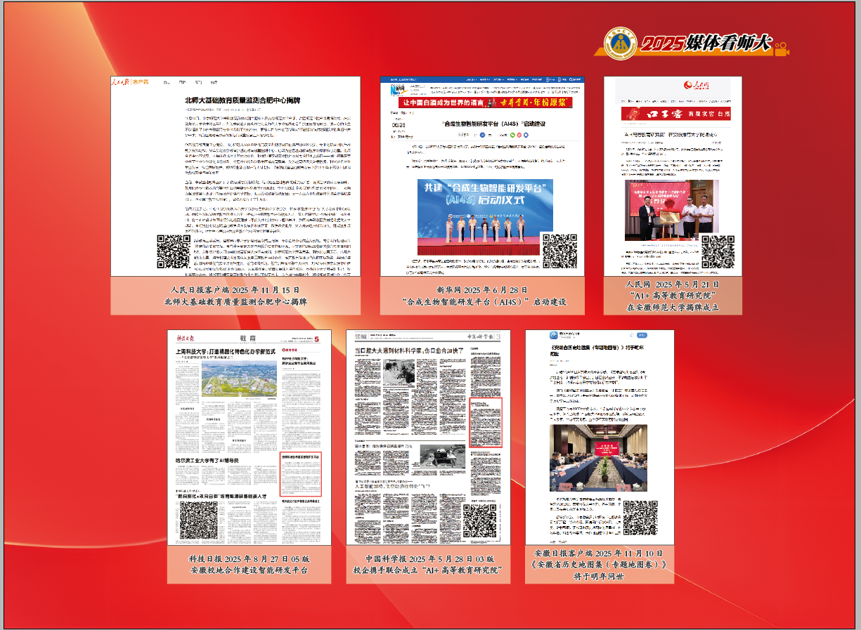 “双一流”建设的成效,最终要落脚于服务社会的实践中。这一年,我校校地合作、平台共建的成果多次被媒体关注报道。与科大讯飞合作成立“AI+高等教育研究院”,聚焦教育数字化转型,研发的智能教学辅助系统、教育数据分析平台等成果,被多家媒体点赞为“科技赋能教育的创新样本”。“AI4S”合成生物智能研发平台的落地建设,整合学科优势资源,瞄准生物医药、绿色化工等前沿领域,成为校地协同创新的重要载体,获得行业媒体重点关注。设立北师大基础教育质量监测合肥中心与安徽师范大学分部,构建覆盖学前至中学全学段的监测体系,为破解安徽省基础教育“不平衡不充分”问题提供数据支撑与决策参考,为区域基础教育质量提升提供人才动能。《安徽省历史地图集(专题地图卷)》横向项目填补安徽历史文化相关研究的空白,系统展现出百万年人类史、一万年文化史、五千多年文明史的安徽图景。从基层治理的智力支持到产业升级的技术赋能,媒体全程见证了这一年我校以实际行动践行“双一流”建设的社会使命,为区域发展做出了师大贡献。