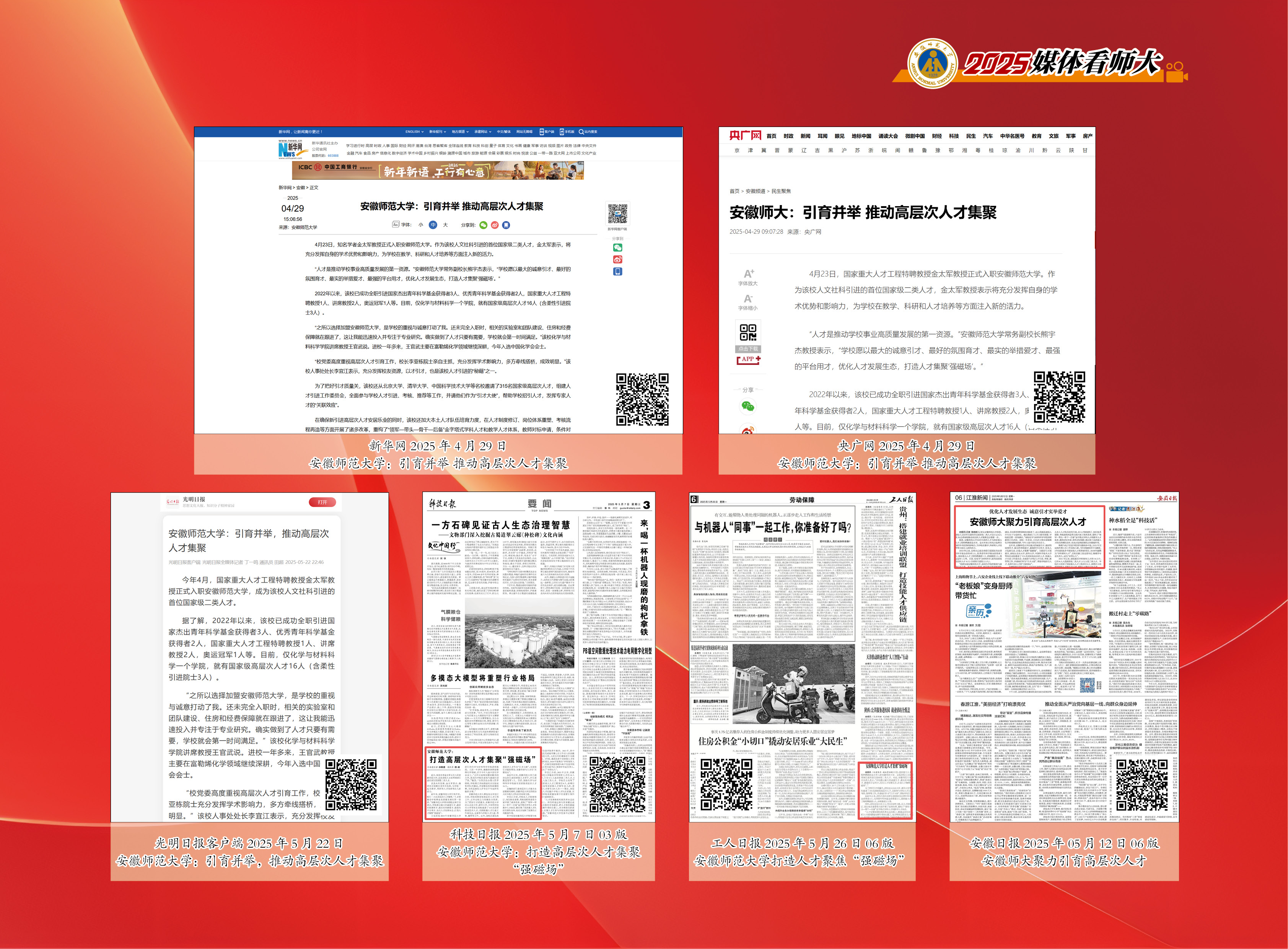 所有的建设成效都来源于人才,人才是推动学校事业高质量发展的第一资源。2025年,新华网、央广网、《光明日报》、《科技日报》及客户端、《工人日报》、《安徽日报》、安徽新闻联播等多家国家级、省级主流媒体集中报道我校优化人才发展生态,打造人才集聚“强磁场”的人才引育典型经验,共同为学校高层次人才招引做出了最好的宣传。