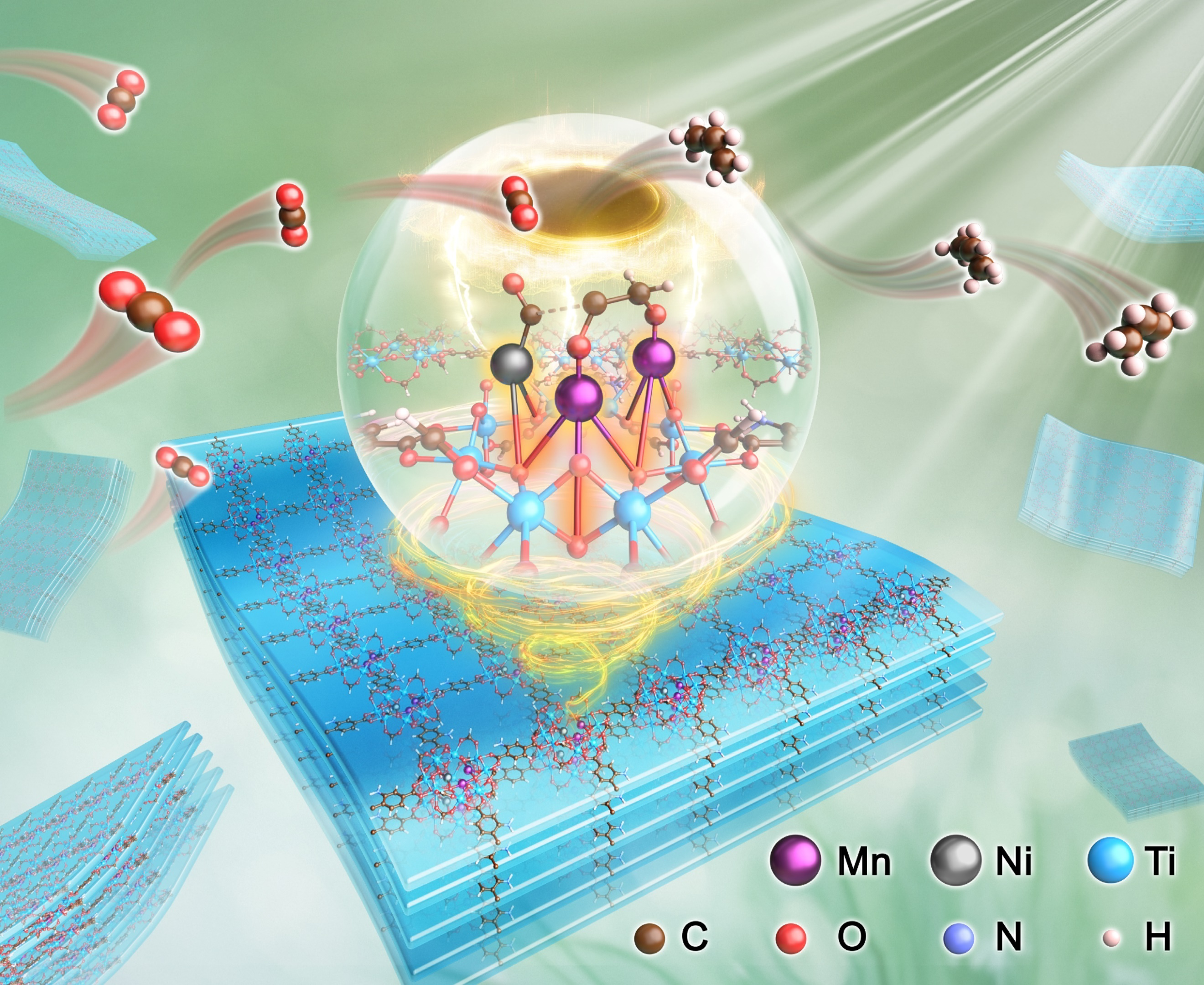 近期,该研究团队报道了一种基于NH2-MIL-125(Ti)纳米片的Ni单原子与Mn双原子共锚定新型光催化剂(Ni1/Mn2-MIL)用于光催化CO2还原。该催化剂通过Ni1与Mn2原子间形成的强电子相互作用构建电荷极化活性中心,协同调控CO2活化及关键中间体*CH2OCOCO的生成,有效降低了C1与C2中间体间的静电排斥,促进了C1-C2偶联生成C3H8。在纯水体系中,该催化剂展现出32.2 μmol g-1 h-1的C3H8产率与81.3%的电子选择性,并具有超过50次循环的良好稳定性。该研究为在原子尺度构建多活性位点催化剂、实现高效CO2光还原制长链碳产物提供了新思路。