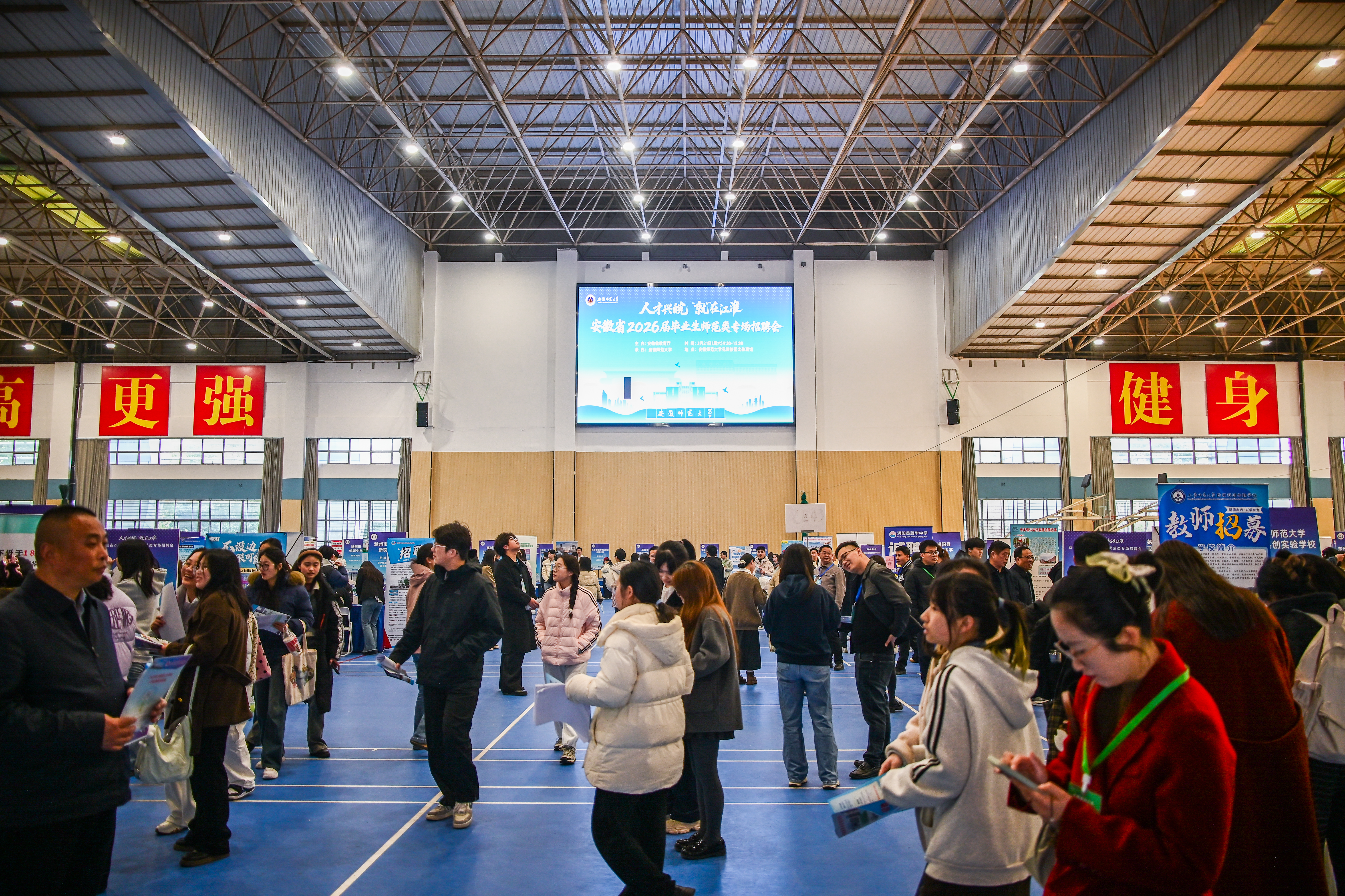 为深入贯彻党中央、国务院关于高校毕业生就业工作的决策部署,全面落实教育部“春季促就业攻坚行动”要求,积极服务安徽省“人才兴皖”战略,3月21日,由安徽省教育厅主办、我校承办的“人才兴皖‘就’在江淮”安徽省2026届高校毕业生师范类专场招聘会在花津校区北体育馆成功举办。安徽省大中专毕业生就业指导中心综合办主任彭飞,校党委常委、副校长高峰、王刚深入招聘现场,与用人单位代表、求职毕业生亲切交流,实地了解岗位供给、求职需求及签约意向等情况。