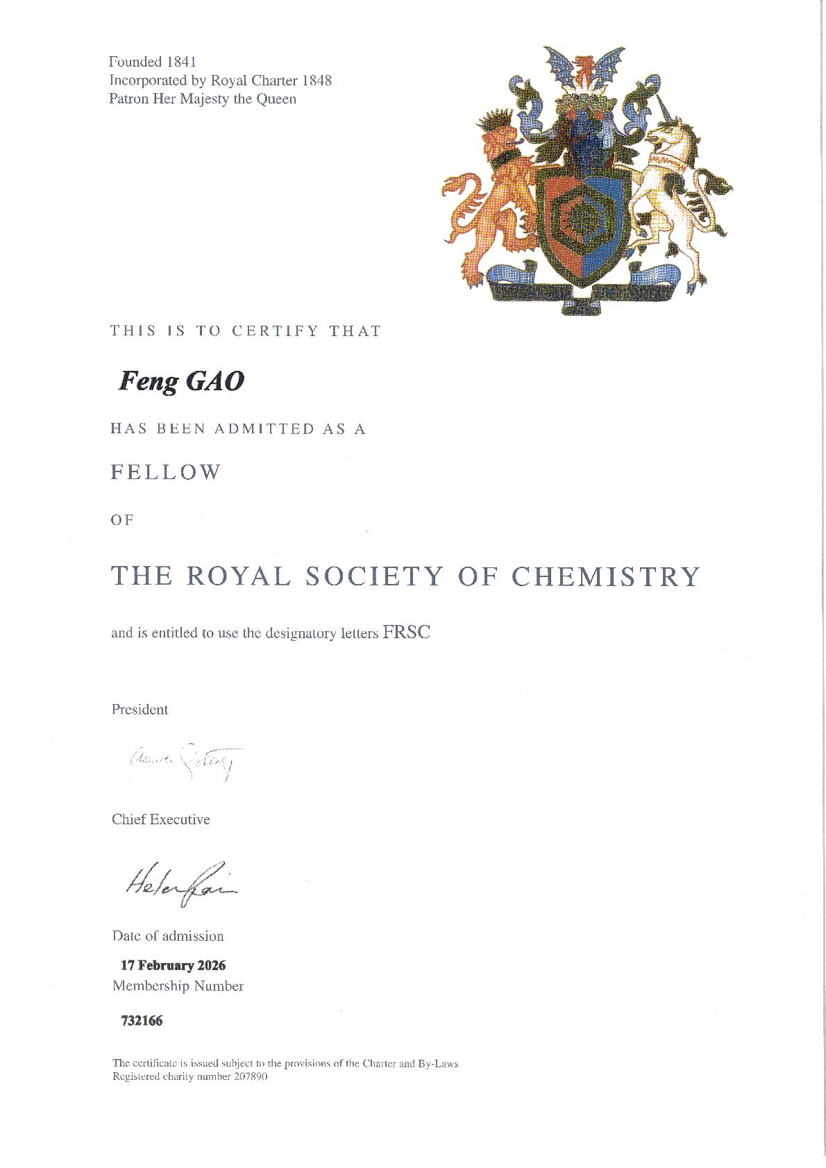 近日,校党委常委、副校长高峰教授收到了英国皇家化学会证书,当选英国皇家化学会会士(Fellow of the Royal Society of Chemistry, FRSC)。
