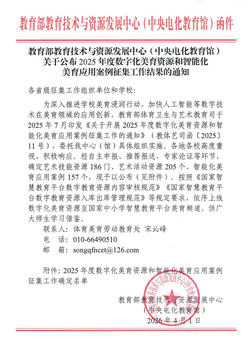 近日,教育部教育技术与资源发展中心(中央电化教育馆)正式公布2025年度数字化美育资源和智能化美育应用案例征集工作结果,我校两个案例成功入选,充分彰显了学校在数字化美育建设领域的扎实积淀与创新活力,是学校美育工作高质量发展的重要成果。