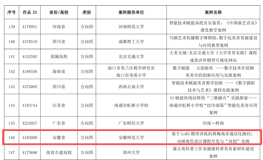 本次案例征集由教育部体育卫生与艺术教育司组织部署,紧扣国家智慧教育平台美育板块建设要求,聚焦数字化美育资源开发、人工智能与虚拟仿真等技术在美育教学中的创新应用,旨在探索数字技术赋能美育育人的有效路径,遴选可复制、可推广的美育实践典型。我校美术学院申报的《雕琢心性 立德树人——徽州三雕的浸润式美育》和新闻与传播学院申报的《基于LoRA模型训练的黄梅戏非遗活化路径:动画角色设计课程开发与“双创”实践》两个案例,分别从数字化美育资源体系构建、智能化美育教学模式创新两个维度,展现了学校以数智技术创新美育路径、提升育人质量的实践探索,为高校美育数字化转型提供了鲜活样本,也体现了教育部对我校美育工作的高度认可。