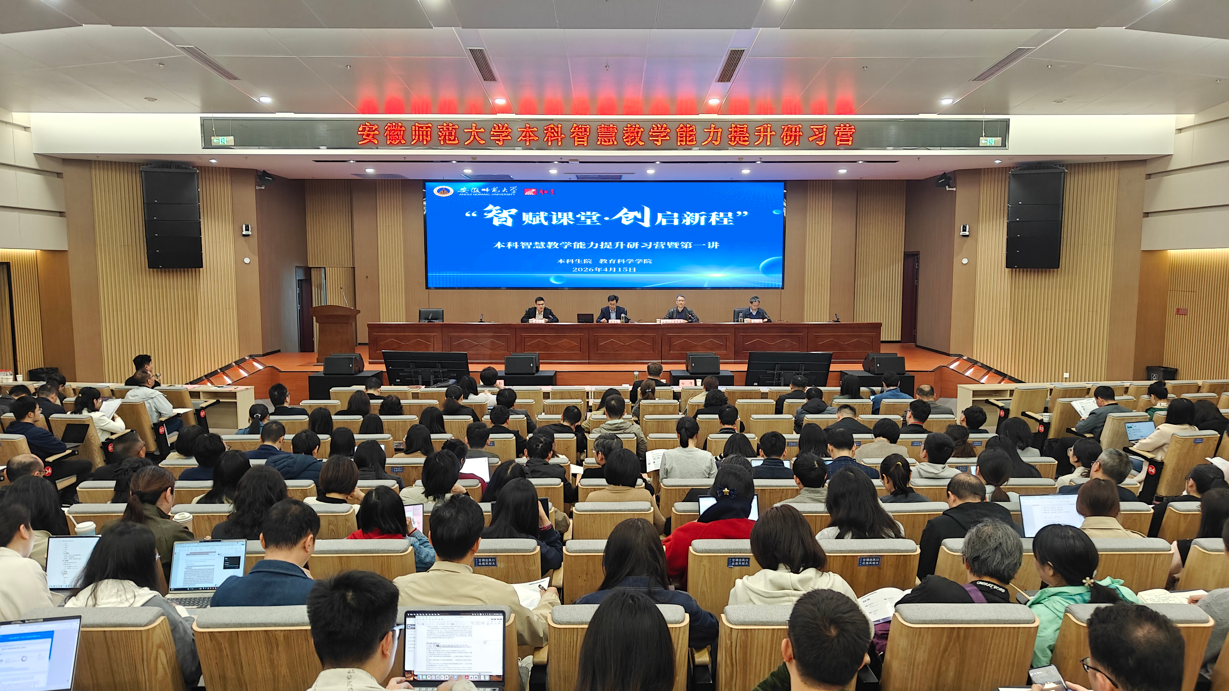 为深入落实国家教育数字化战略,紧扣学校提升本科教育教学质量核心部署,4月15日下午,安徽师范大学“智赋课堂 创启新程——本科智慧教学能力提升研习营”在花津校区文典楼正式开营。校党委常委、副校长桑青松出席并致辞,宣布研习营开营。本次会议由本科生院院长崔光磊主持,本科生院副院长赵冰、教育科学学院院长吴文涛,以及各学院分管教学负责人、教师代表与教学秘书近四百人参加研习营。