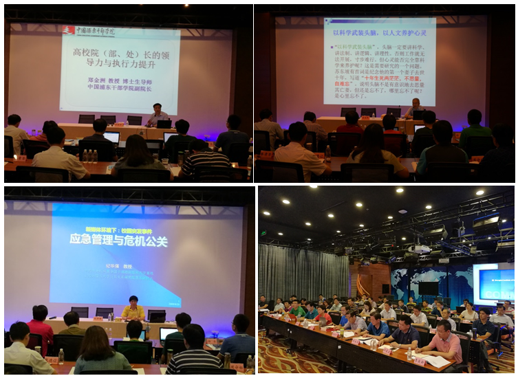 学员们在复旦大学新闻学院培训中心聆听了上海师范大学原党委书记陆建非教授所作《全球高教发展趋势与中国高教国际化》、上海科技大学副校长印杰教授所作《“十三五”规划与高教改革发展》、复旦大学博士生导师陈家宽教授所作《高校领军人才建设及青年教师培养》、上海市人大法工委副主任施凯所作《关键在党,党要管党,从严治党——十八届六中全会精神解读》、上海应用技术大学校长陆靖教授所作《高质量本科教学和创新创业人才培养的思考与实践》、复旦大学研究生院院长钟扬教授所作《重点学科培育和科研平台建设》、复旦大学高等教育研究所所长熊庆年教授所作《把握新机遇、迎接新挑战——“双一流”建设思考》、中国浦东干部学院副院长郑金洲教授所作《高校院(部、处)长的领导力与执行力提升》、上海开放大学副校长王伯军教授所作《高校领导干部的人文视野与心灵养护》、上海外国语大学国际工商管理学院教授纪华强所作《高校公共危机事件中的舆情控制与媒体公关》等共10个高水平报告。这些专家、学者对新形势下我国高校在党的建设、事业规划发展、人才培养、科学研究、社会服务、国际交流与合作、文化传承创新、师资队伍建设、管理队伍建设等方面进行了积极探索,为我们提供了有益的借鉴。
