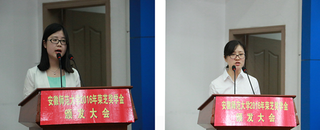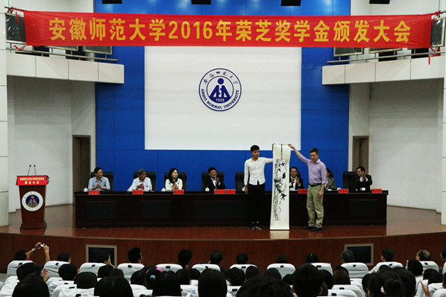 大会在雄壮的国歌声中拉开帷幕。副校长朱家存宣读了颁发决定,与会嘉宾和领导向获奖学生颁发了荣誉证书。生命科学学院2013级生物技术专业王静同学代表本届荣芝奖学金获得者发言,畅谈了自己对荣芝基金会宗旨的理解;外国语学院2009级英语专业本科生、现为上海外国语大学博士生余畅同学代表首届荣芝奖学金获得者分享了自己对荣芝基金会的感激之情,并立志去践行和传承荣芝精神。接着,获奖学生代表向荣芝基金会代表张卓瀚先生赠送国画作品,表达我校学子对嘉宾和基金会的敬意与感激之情。随后,基金会代表张卓瀚先生结合家族做公益事业的善举和个人成长发展的经历,告诫同学们要有负责任的做人态度和专业的做事态度;林子琳女士从女性视角勉励同学们要珍惜当下,确立目标,把握机会,认真做好人生每一次选择。最后,校党委副书记李琳琦在讲话中对基金会给予我校的帮助和支持表达了由衷的感谢,对张卓瀚先生、林子琳女士不辞辛苦、远道而来表达了崇高的敬意,希望广大同学自立自强、做勇往直前的奋进者,学会感恩、做甘于付出的奉献者,勇于担当、做走在时代前列的开拓者。