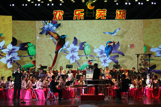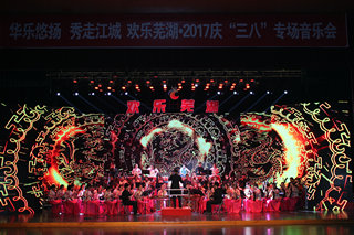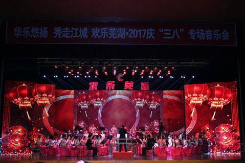 本网讯(音乐学院 文/张崇 梁鑫淼 图/黄婧 )华乐悠扬,秀走江城。为展现时代巾帼风采、讴歌女性光荣使命,3月8日晚,芜湖市大剧院歌声响彻,灯火通明,由芜湖市委宣传部主办,市妇联、市文化委、安徽师范大学音乐学院等单位承办的欢乐芜湖.2017庆“三八”民族管弦乐专场音乐会在这里隆重举行,安徽师范大学民族管弦乐团承担了整场的演出任务。安徽师范大学党委书记顾家山,芜湖市政协主席胡邦明,市委副书记张峰,市委常委、宣传部长段玉嘉等领导出席演出现场,与来自全市的一线优秀女职工、三八红旗手、三八红旗集体、巾帼建功标兵、巾帼建功先进集体、巾帼文明岗、最美家庭等先进典型和女企业家、女知识分子以及社会各界代表1000余人共同欣赏了一场高雅艺术的视听盛宴。