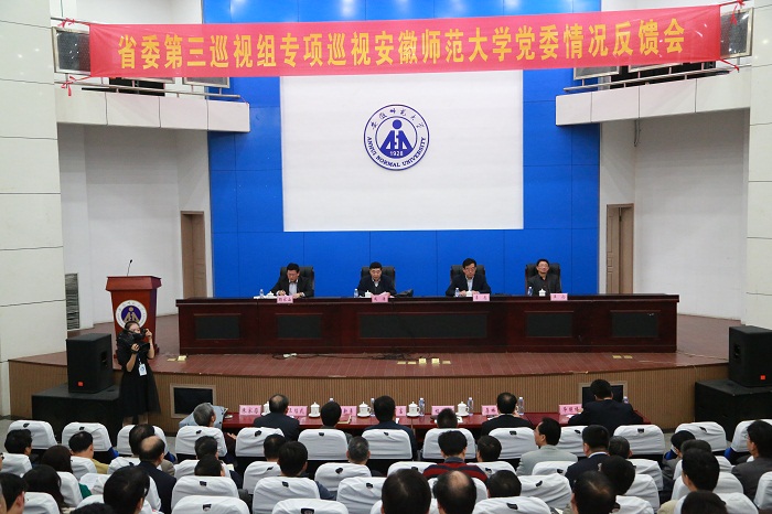 ,省委第三巡视组向安徽师范大学党委反馈专项巡视情况。省委第三巡视组组长成浩、副组长李彪向校党委书记顾家山传达了李锦斌书记在省委“五人小组”会议上的讲话精神。之后,成浩代表省委巡视组向校党委领导班子进行了反馈,顾家山主持会议并作表态发言。