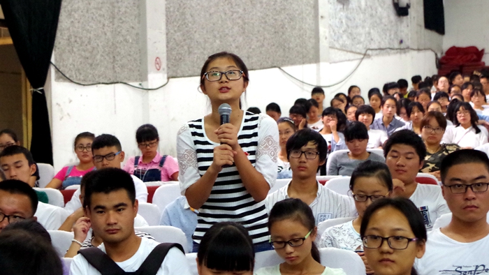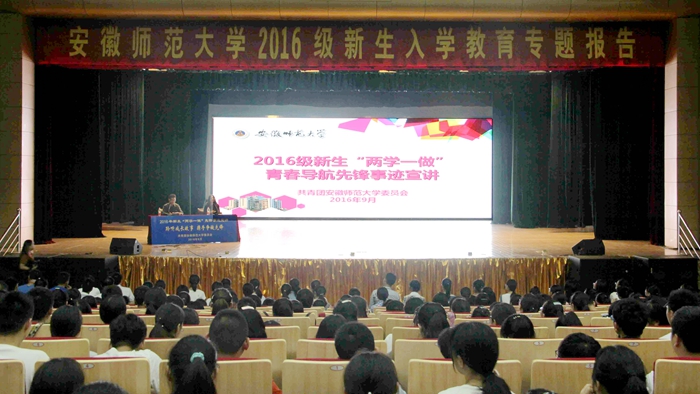 报告团成员由近年来学校涌现出的“师大骄子”十佳大学生、“爱暖师大”十佳(优秀)青年志愿者、大学生“自强之星”等各类学生党员、入党积极分子、优秀共青团员组成。9月5日至9月21日,报告团成员在赭山校区、花津校区大礼堂为2016级新生作了共计12场次的宣讲。中国青少年科技创新奖获得者耿竞分享了大学以来的学术科研经历和领奖时的喜悦,鼓励同学们追求梦想、坚持不懈;2015年“创青春”中国青年互联网创业大赛金奖获得者、2015年安徽省大学生“创业之星”陈博群分享了创新创业的感想与收获,弘扬“匠人文化”精神;校十佳大学生、十佳青年志愿者杨哲以自己在西部支教的经历鼓励同学们勇于自我成长、乐于服务他人;全国大学生艺术展演国家二等奖获得者、校学生会主席盖晨飞讲述了她从一个普通学生到社会实践达人的成长蜕变……优秀学子的成长经历深深感染和激励着每一名新生,此起彼伏的掌声喝彩声、热情踊跃的现场互动,新生们通过各种方式表达着对这些“校园先锋”们的敬佩和向榜样学习的决心。其间,校团委回应学生诉求,围绕本科生素质拓展学分实施方案作关于大学生素质拓展工程专题报告。