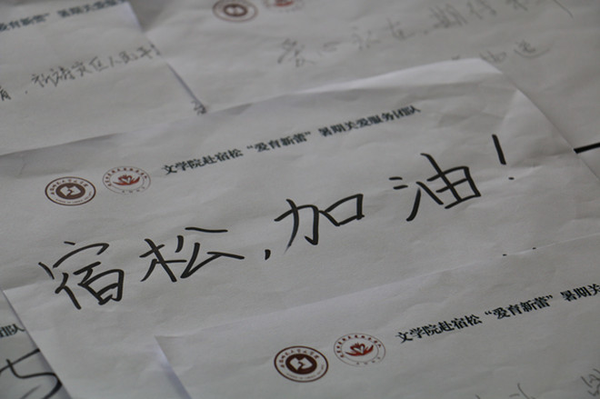 当大雨倾盆遮住人们前进的方向,青春奉献的星火却将这里点亮。文学院“爱育新蕾”关爱服务团队积极响应防汛救灾集结号,投身芜湖镜湖小学灾民安置点开展志愿服务活动,他们利用黑板报开展防汛、安全等主题教育,精心制定“防洪安全”手册。他们情系宿松,化笔为犁,积极开展“情系宿松”系列活动,发动师大老师和同学以手写寄语的形式为宿松送去关爱与祝福,积极组织公益募捐活动,获捐《孝弟三百千》《弟子规》等大量书籍,为灾区孩子送去精神食粮。