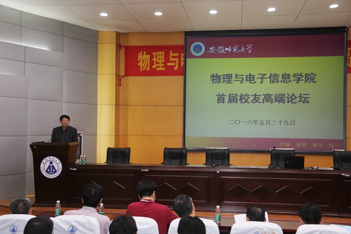本网讯(物电学院)英才校友汇聚高端论坛,思源致远共谋母院发展。5月29日上午,物电学院在赭山校区田楼报告厅隆重举行首届校友高端论坛,中国科学院物理所汪卫华院士,上海交通大学张卫平教授、齐飞教授,中国科学院武汉物理所高克林研究员,南京大学谢代前教授,苏州大学蔡阳健教授,中科院西安光机所姚保利研究员,中科院合肥分院黄伟研究员等23位杰出校友代表和邀请嘉宾参加了本届论坛。校长王伦教授,科研处处长陆林教授,校友办公室主任王刚及物电学院领导、部分教师、研究生和本科生代表参加了本届论坛。大会由物电学院院长崔执凤主持。