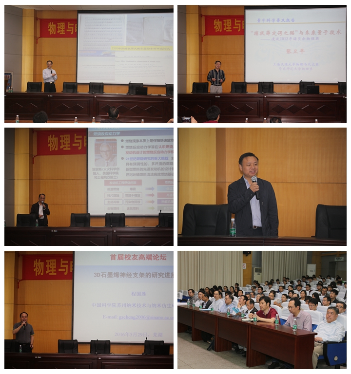 会上,五位杰出校友分别做了前沿学术报告。其中中国科学院院士汪卫华院士系统阐述了“从动力学角度认识无序非晶物质的本质和特性”,上海交通大学张卫平教授从“薛定谔之猫”入手讲授了“捕捉薛定谔猫”与未来量子技术。上海交通大学齐飞教授详细介绍了近几年来同步辐射真空紫外光电离质谱技术的发展及其在多种燃烧研究中的应用情况,分析了“同步辐射光电离质谱技术在燃烧与新能源研究中的应用”。北京天智航医疗科技股份有限公司董事长、2011年中关村高端领军人才张送根研究员重点介绍了“骨科机器人研制与临床应用”。中国科学院苏州纳米技术与纳米仿生研究所程国胜研究员阐述了“3D石墨烯神经支架的研究进展与关键挑战”。