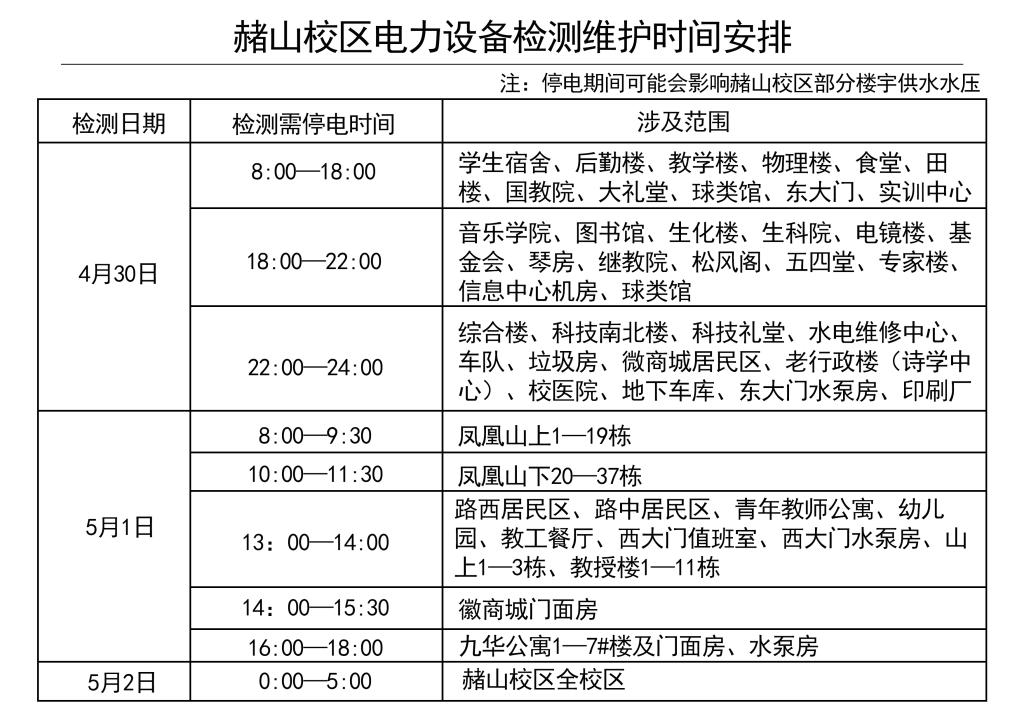 根据学校疫情防控工作要求,确保电力设施设备安全运行,保障教学、科研、学生生活正常秩序,自2020422日至52日(遇阴雨天,时间顺延),后勤管理处近期组织对花津校区和赭山校区高压电房、电力设施设备进行预防性安全检测与维护。检测过程中,涉及需停电区域,后勤管理处将在实施前电话与相关单位协商,请校内各单位、住户、师生在接到停电通知后,做好信息传递沟通,合理安排好相关事宜(停电期间,任何单位与个人不得进行电力施工)。不便之处,敬请谅解。